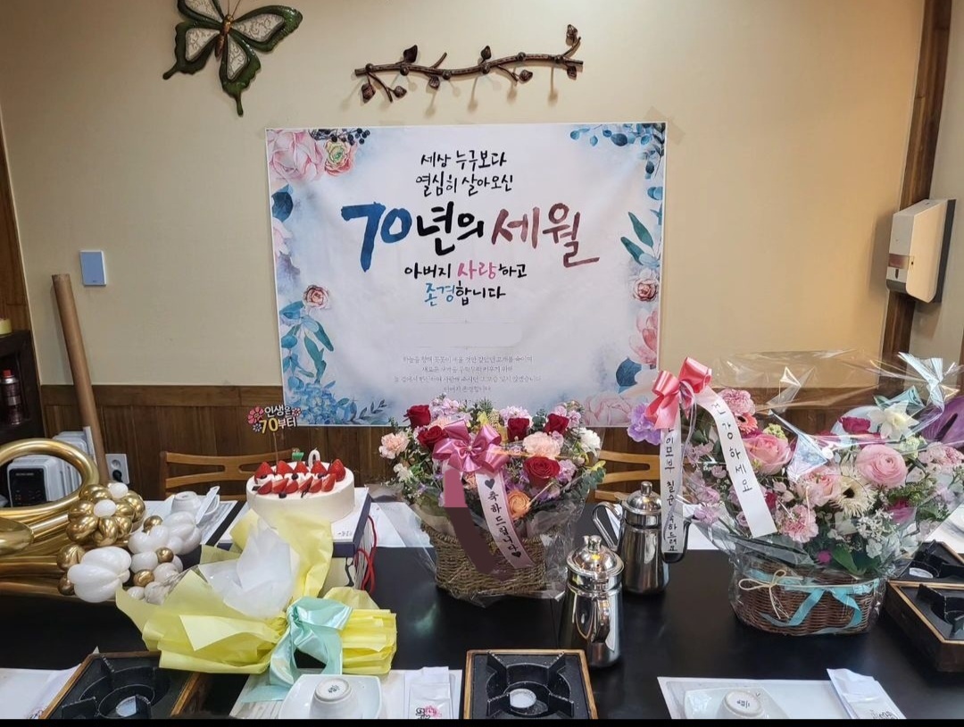 이것 저것 꾸미고 가족들의 꽃다발로 잔치 분위기가 난다.