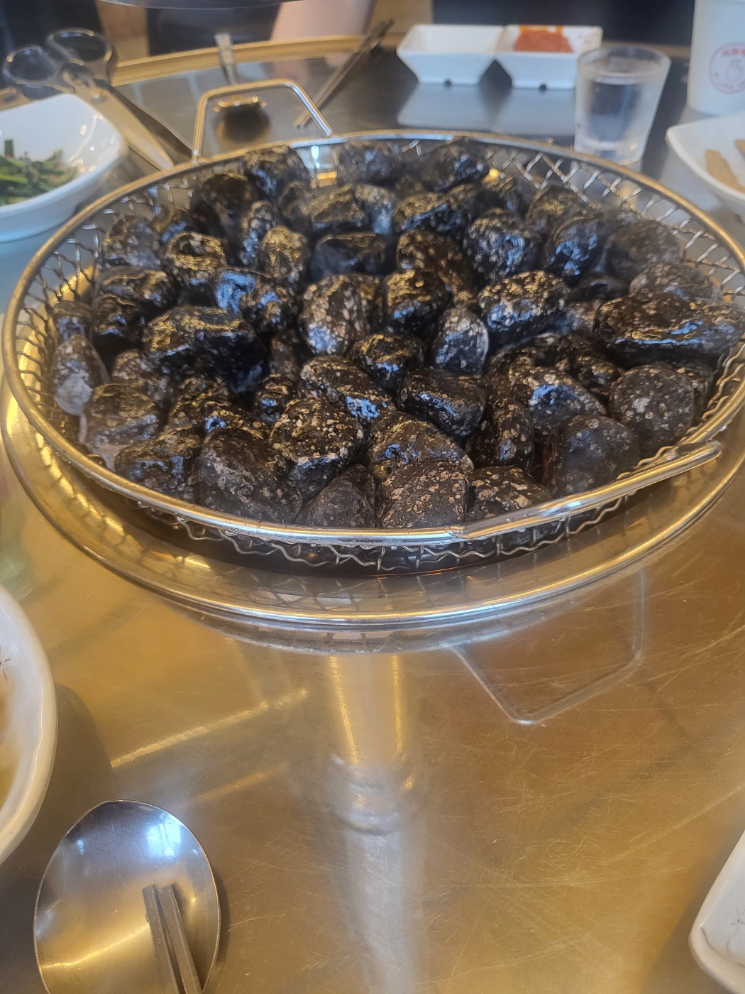 고기를 주문하면 맥반석이 나오고 고기 기름으로 고기가 돌에 늘러붙지 않게 발라 준다.