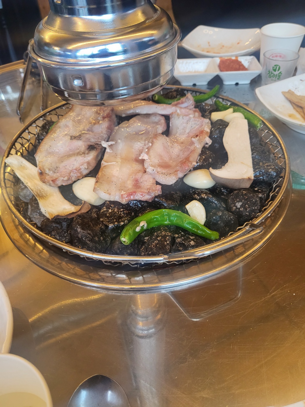 그리고 곁들여 주시는 꽈리고추와 버섯을 같이 구워 먹으면 그렇게 맛있다.