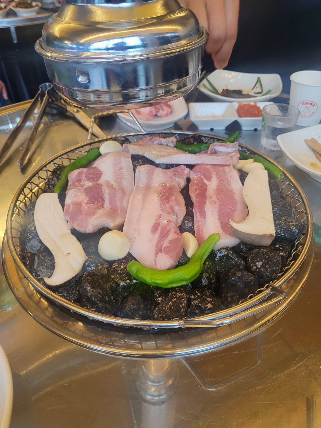 고기를 주문하면 맥반석이 나오고 고기 기름으로 고기가 돌에 늘러붙지 않게 발라 준다.